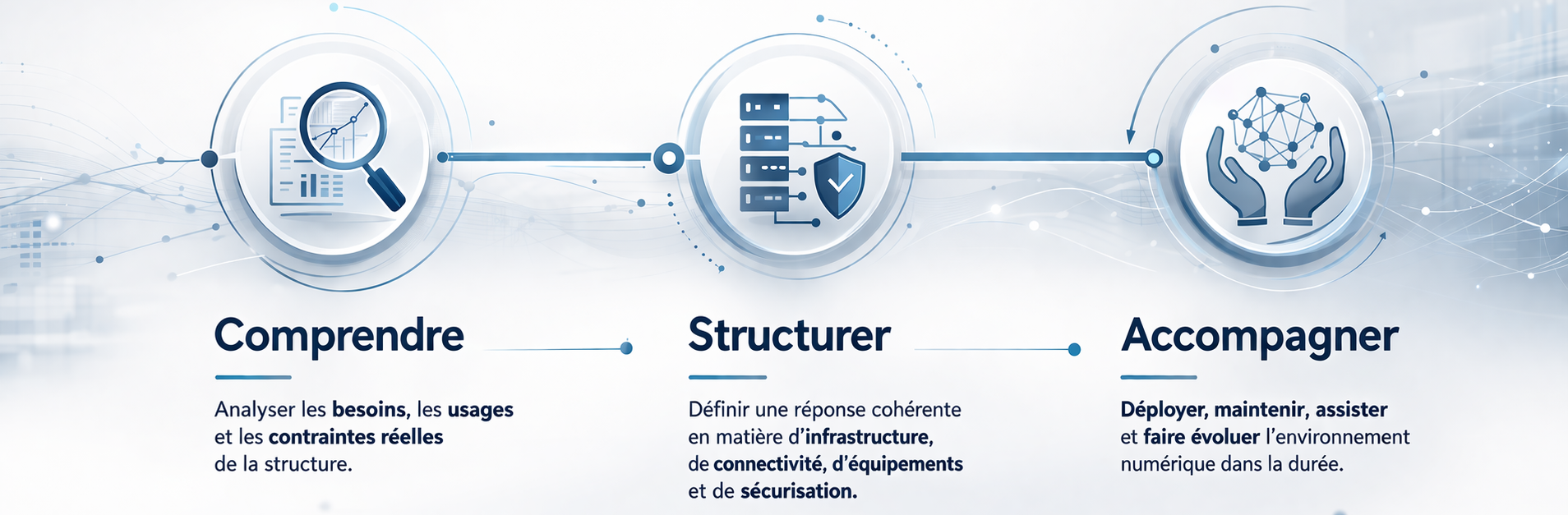 Approche globale : support IT, infogérance, sécurité, connectivité, équipements et conseil s’inscrivent dans une même logique de cohérence.